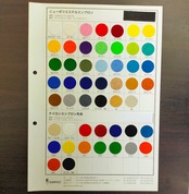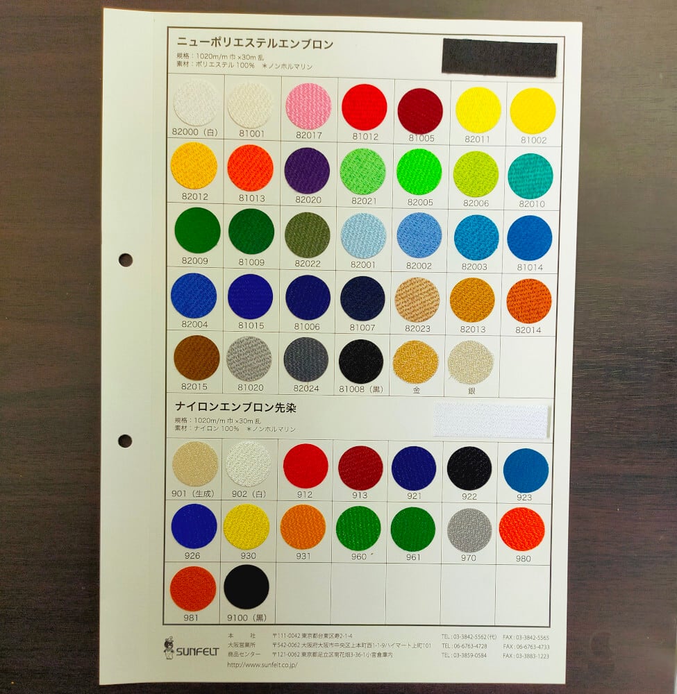 刺繍ワッペンのベース生地によく使われる、織生地「ニューポリエステルエンブロン」のサンプル帳です。実際の生地色を見てから購入したい方におすすめ。