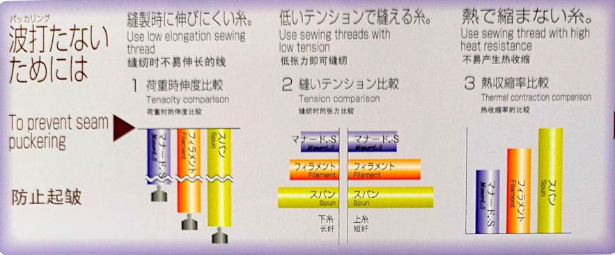 フィラメントとスパンそれぞれの長所(高強力・高モジュラス)と適度な摩耗特性・耐熱性をもつので、均整な縫い目と強度を保持してくれます。ミシン機種や素材を問わず使える汎用性の高さも魅力。