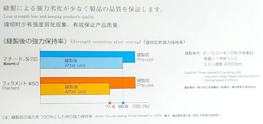 フィラメントとスパンそれぞれの長所(高強力・高モジュラス)と適度な摩耗特性・耐熱性をもつので、均整な縫い目と強度を保持してくれます。ミシン機種や素材を問わず使える汎用性の高さも魅力。